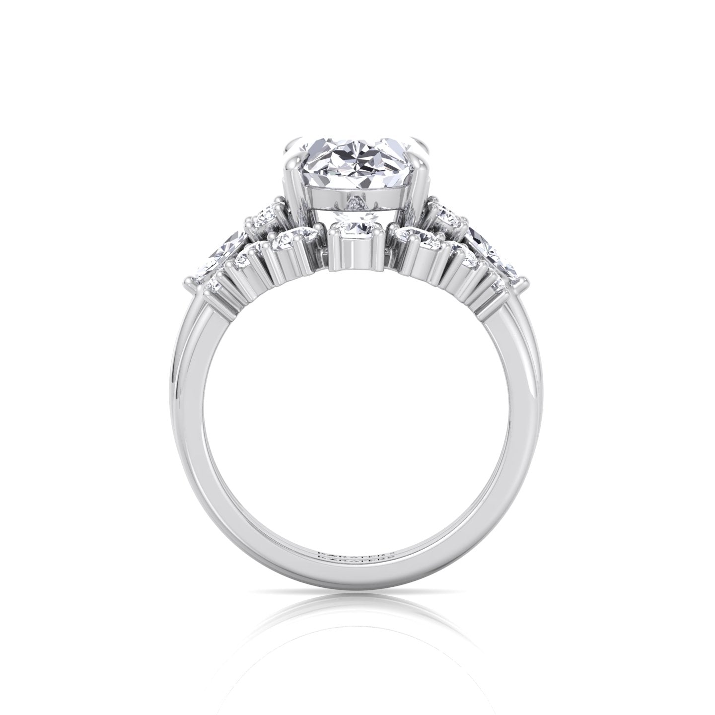 This Oval with Side Stones Lab-Grown Diamond Wedding Set features an oval center stone accented by two round diamonds on each side, followed by a marquise diamond for a unique and elegant touch. The arrangement creates a harmonious balance of shapes, highlighting the brilliance of each stone while drawing attention to the center.