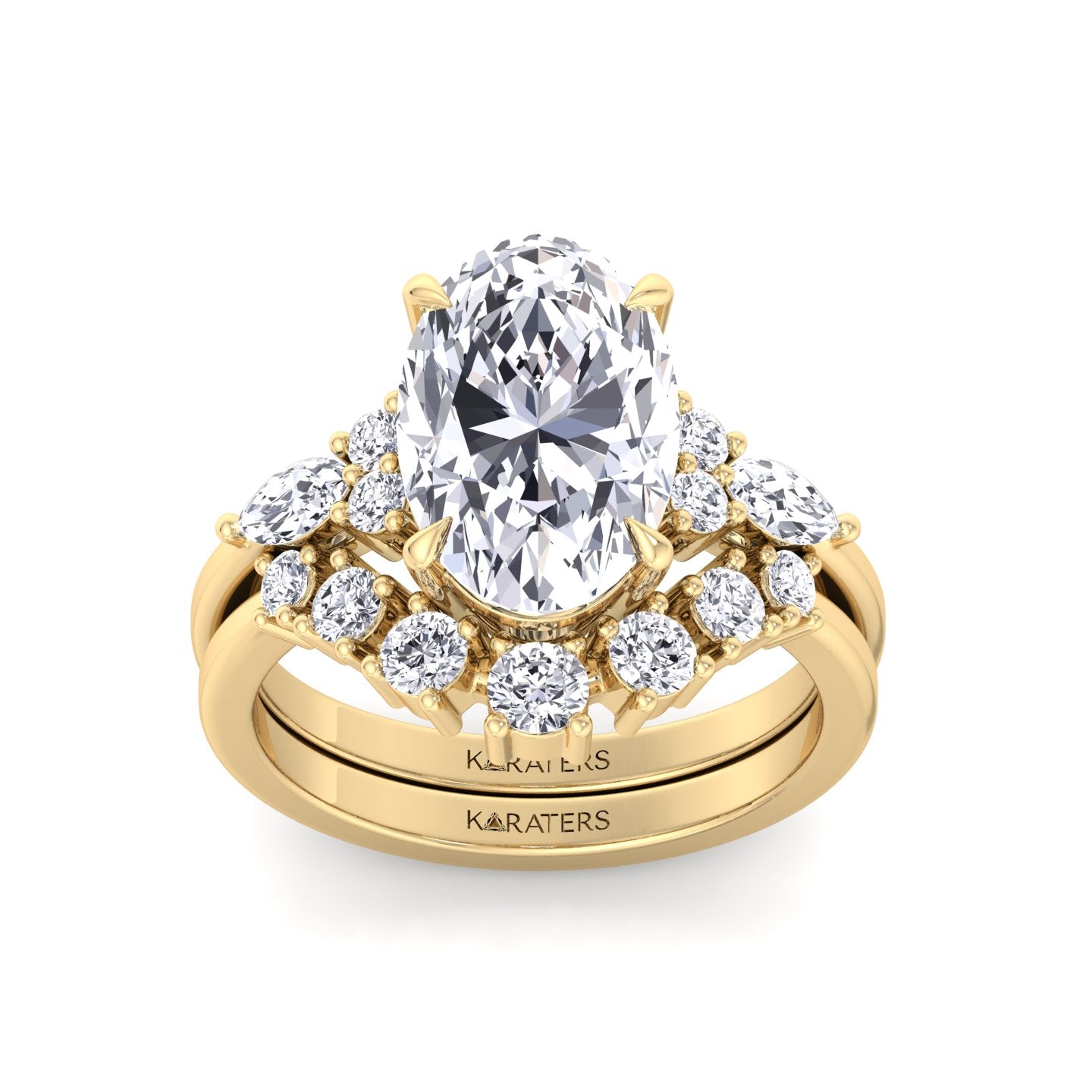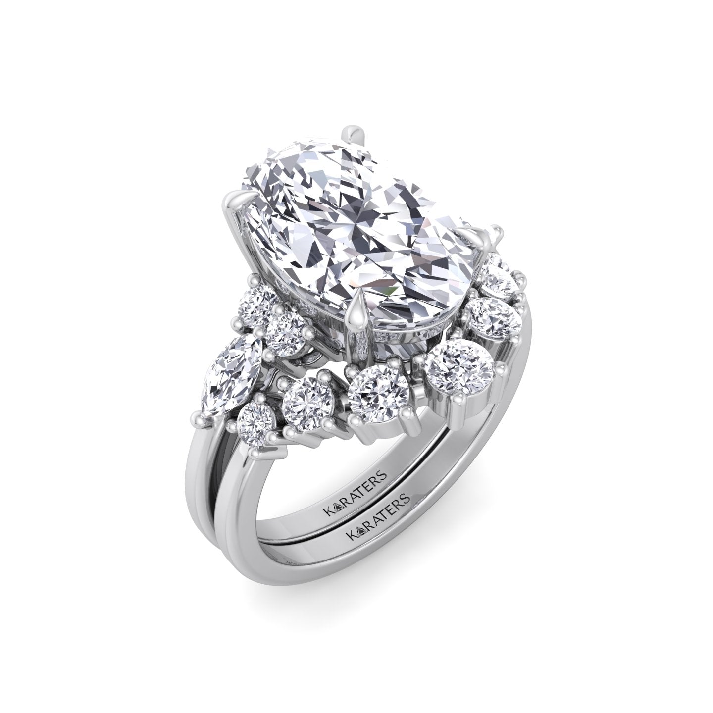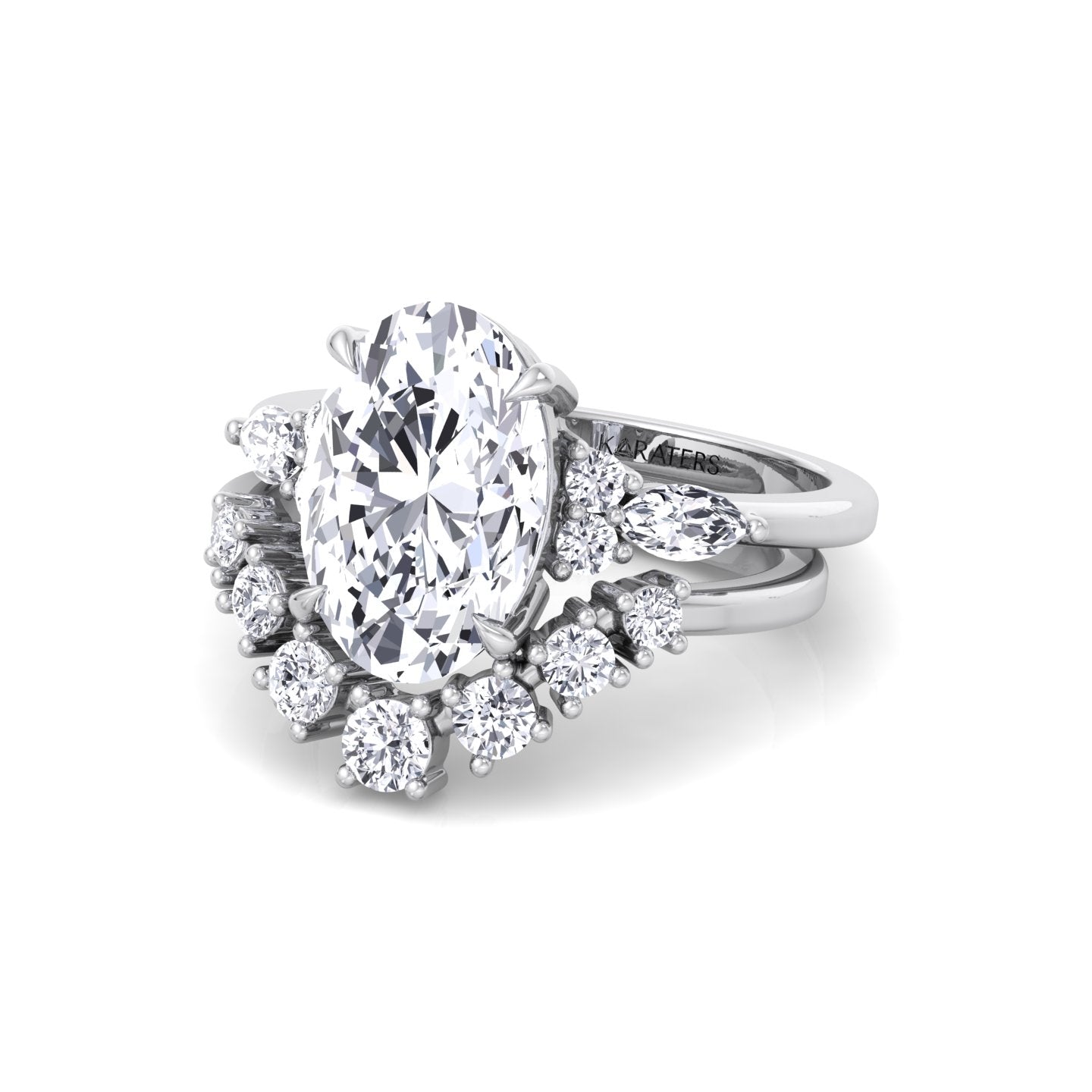 Oval with Side Stones Lab-Grown Diamond Wedding Set featuring an oval center stone accented by round and marquise side diamonds for a unique, elegant look. Paired with a matching curved band of graduated round diamonds, this set creates a seamless blend of classic style and modern sophistication.