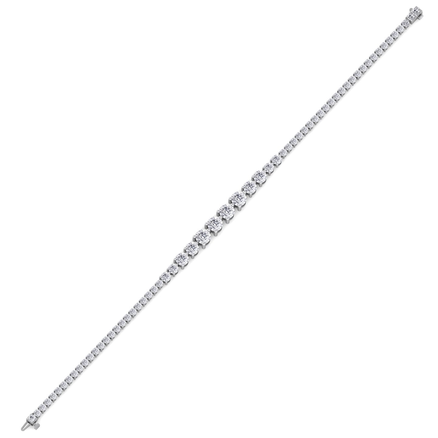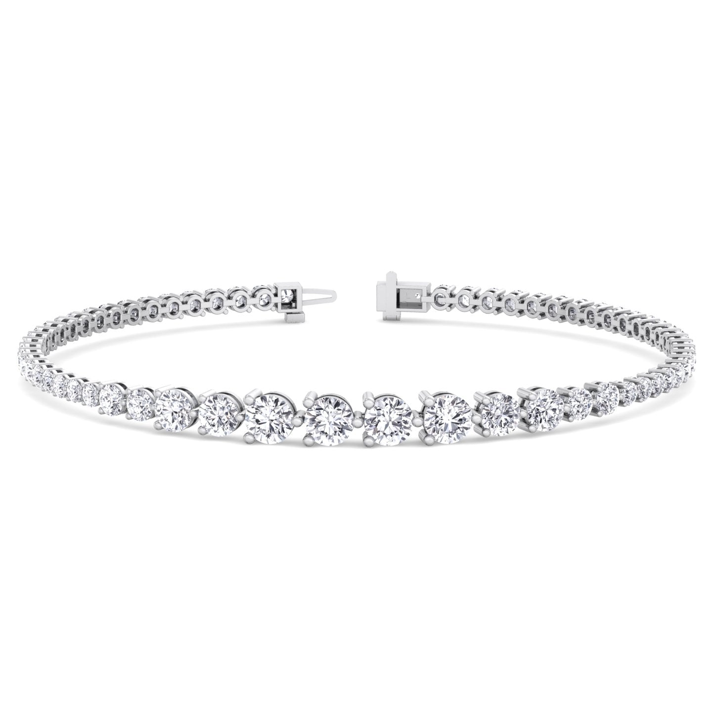 3-Prong Graduated Lab-Grown Diamond Tennis Bracelet featuring round diamonds that gradually increase in size for a smooth, refined flow. Set in secure three-prong mounts with a durable underlock clasp, it delivers timeless style and versatile elegance for any occasion.