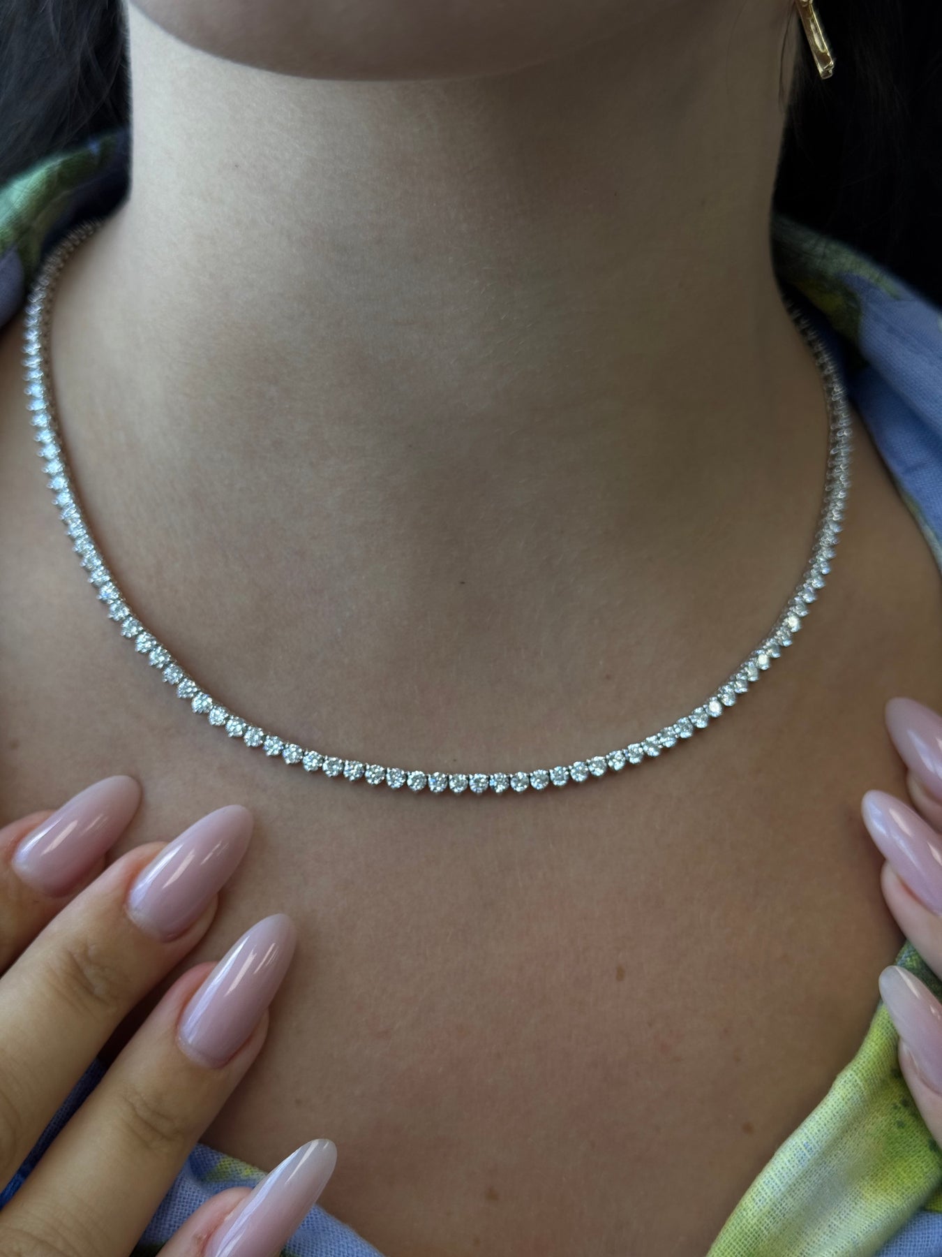 This 3 Prong Lab Grown Diamond Tennis Necklace in Martini Style is a dazzling masterpiece that effortlessly combines elegance and luxury. Set in a famous 3 prong martini style, this allows the lab grown diamond to radiate an unparalleled brilliance. This tennis necklace complements a variety of styles, making it the perfect accessory for both casual and formal occasions.