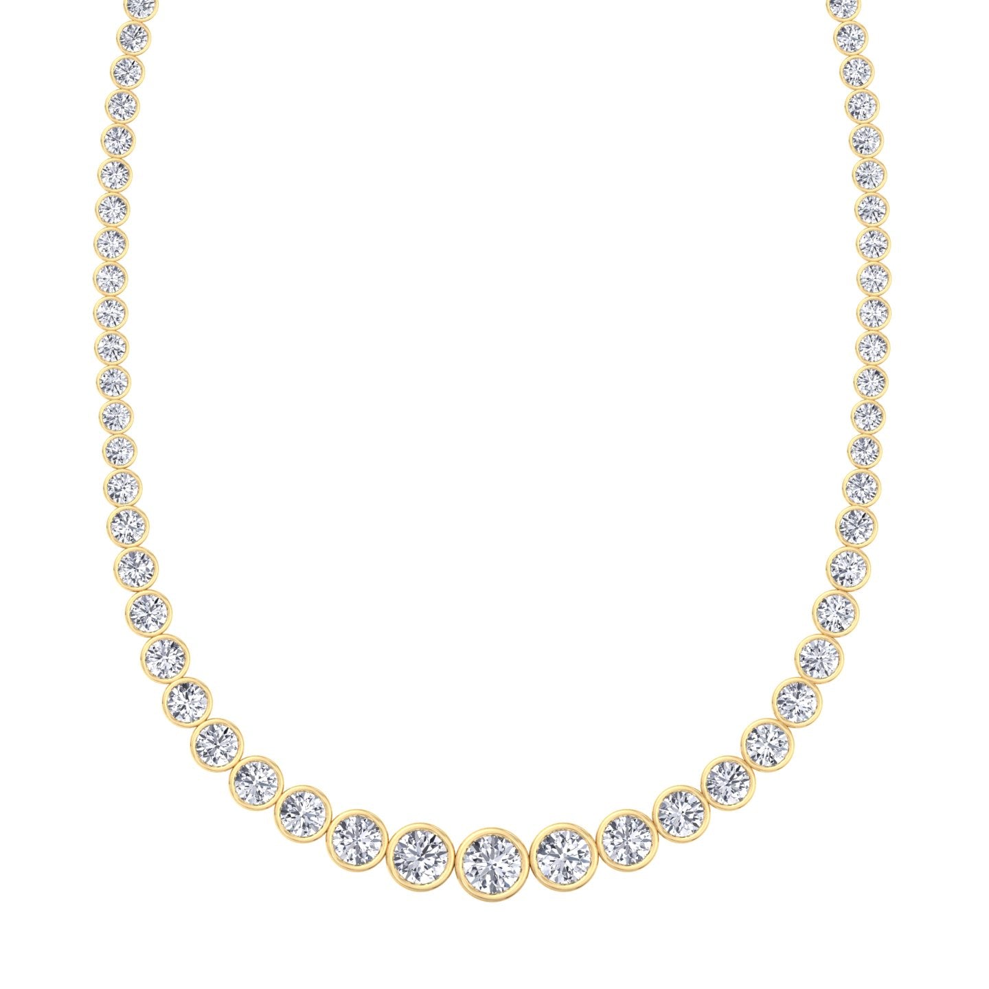 This Bezel Set Graduated Lab-Grown Diamond Tennis Necklace features round cut diamonds arranged in a graceful graduated pattern, with each stone securely framed in a smooth bezel setting. The design offers a refined balance of brilliance and modern sophistication.