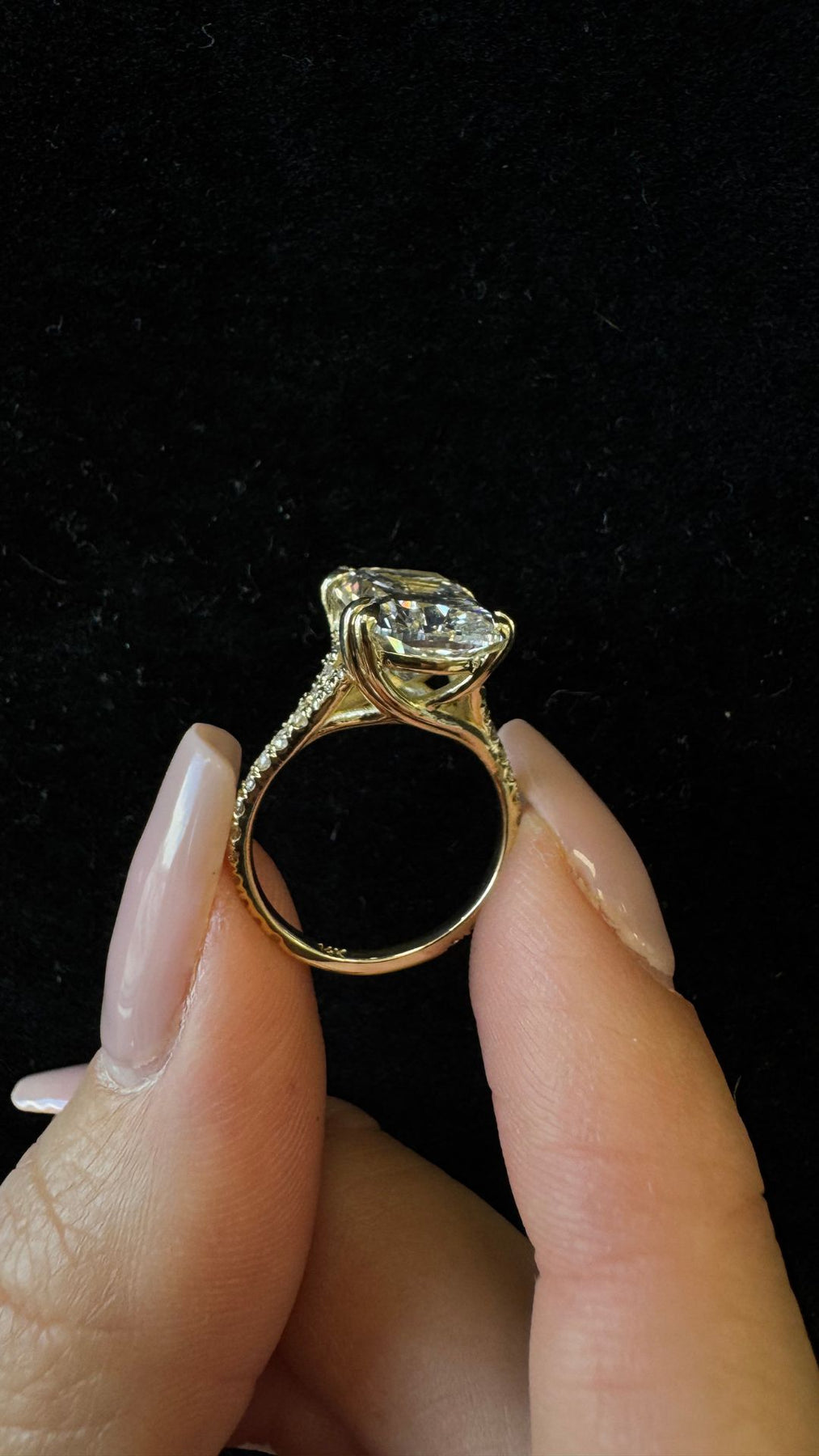 This Elongated Cushion Shape Lab Grown Diamond Engagement Ring is a Gorgeous piece featuring an elongated cushion center stone, a unique double claw setting, a pave band, and a hidden round shape diamond, making this ring genuinely shine.