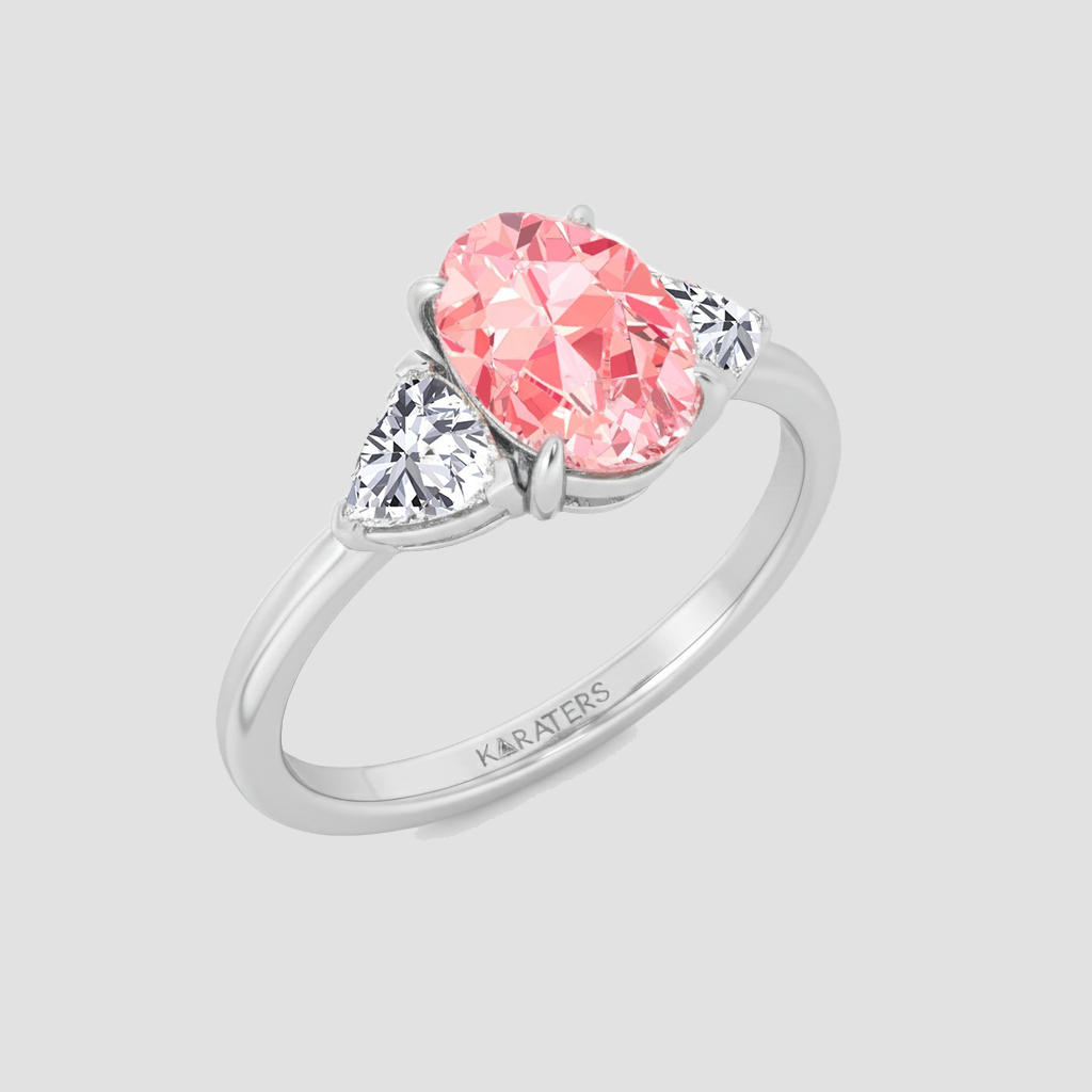 This elegant three-stone ring showcases a fancy pink oval lab-grown diamond accented by two white pear-shaped diamonds. Its smooth, refined silhouette brings a modern yet timeless feel, offering brilliant sparkle with a sustainable touch. A breathtaking piece designed to shine with effortless sophistication.