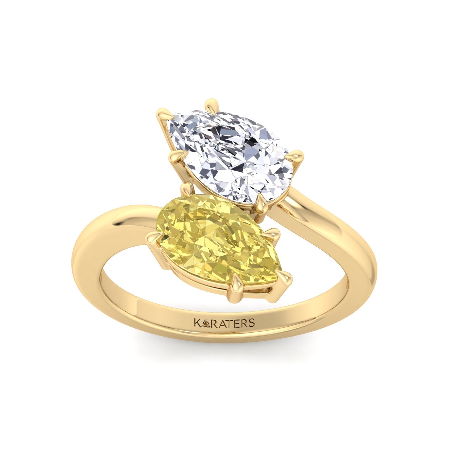 Fancy Yellow Pear Shape Lab-Grown Diamond Bypass Two Stone Engagement Ring with dual pear-shaped diamonds—one in vivid yellow and one in classic white—set in secure prongs. A modern bypass design that symbolizes two paths united in a bold expression of love.