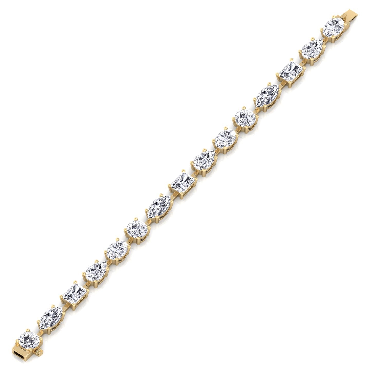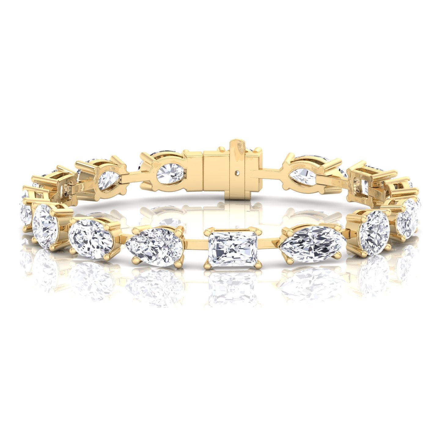 This Mixed Shape Combo Lab-Grown Diamond Tennis Bracelet in 18K solid gold features a striking arrangement of round, oval, pear, radiant, and marquise diamonds, each set with space between for a modern, airy look. The four-prong setting secures every stone while allowing maximum brilliance to shine through.