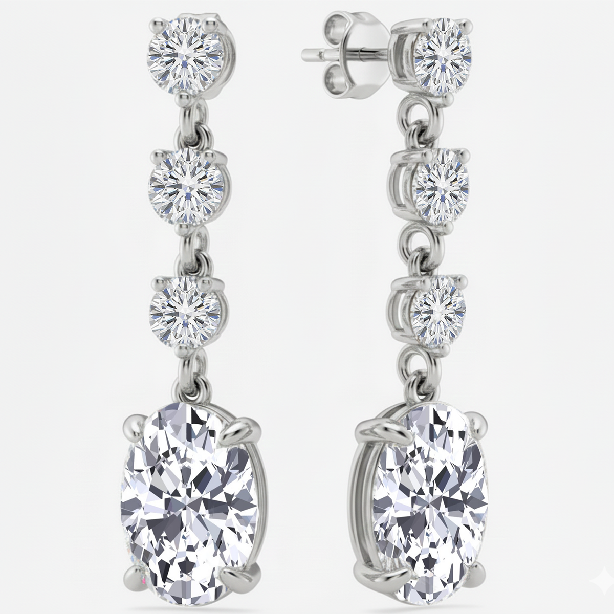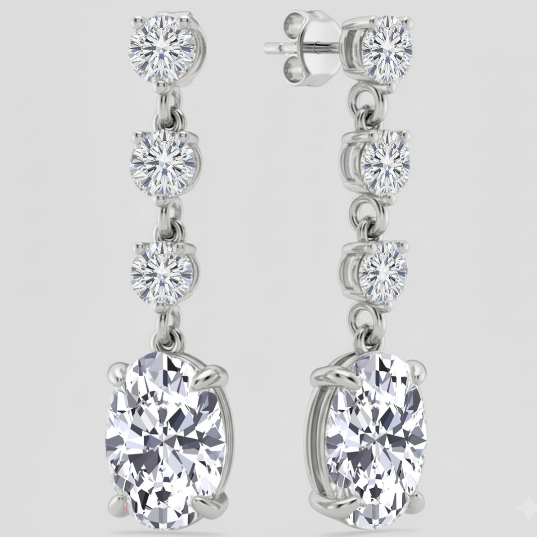 These elegant drop earrings feature a seamless flow of round lab-grown diamonds from top to center, finished with a single larger oval diamond at the base. Each stone is meticulously secured in classic prong settings, allowing maximum sparkle and clean, refined detailing from every angle.