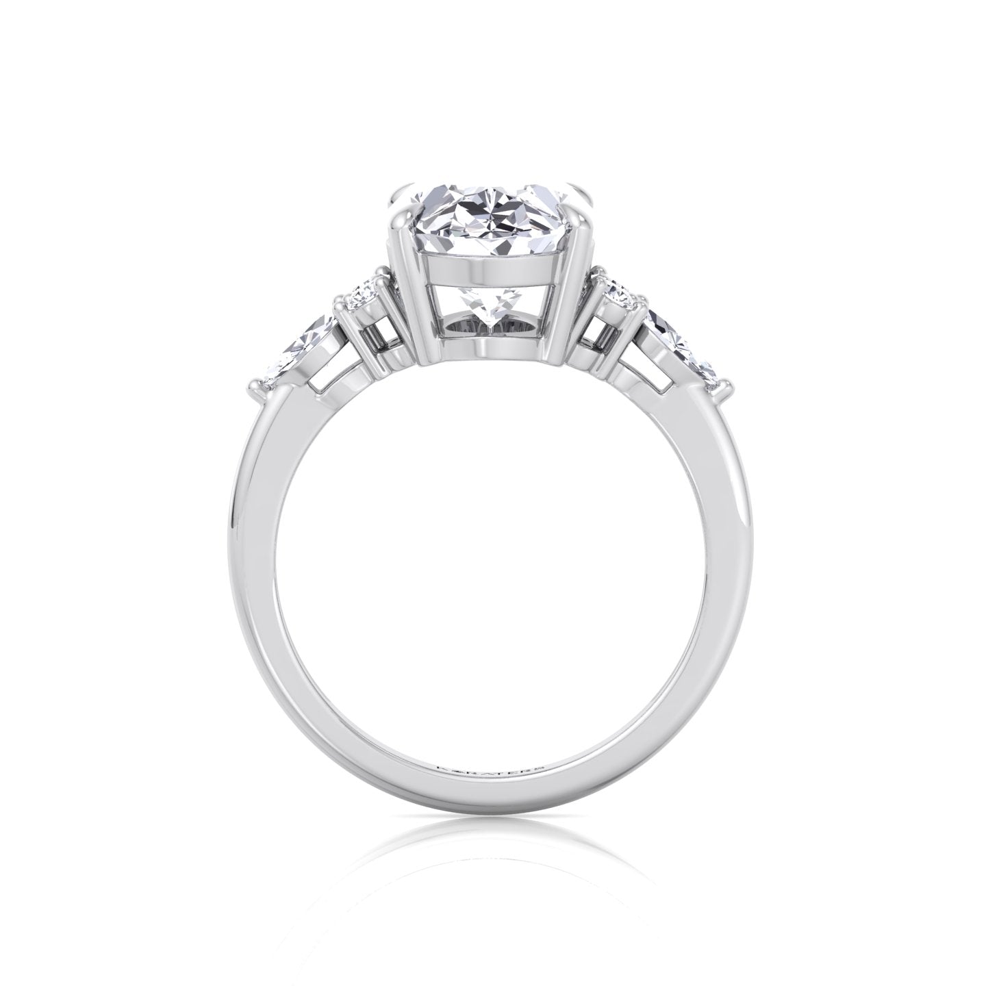 This Oval Cut Lab Grown Diamond Engagement Ring showcases a timeless oval center stone accented by vertical round diamonds and a horizontal marquise on each side. Set in classic prongs with a sleek, unembellished band, the design highlights the graceful silhouette and modern elegance of the clustered setting.
