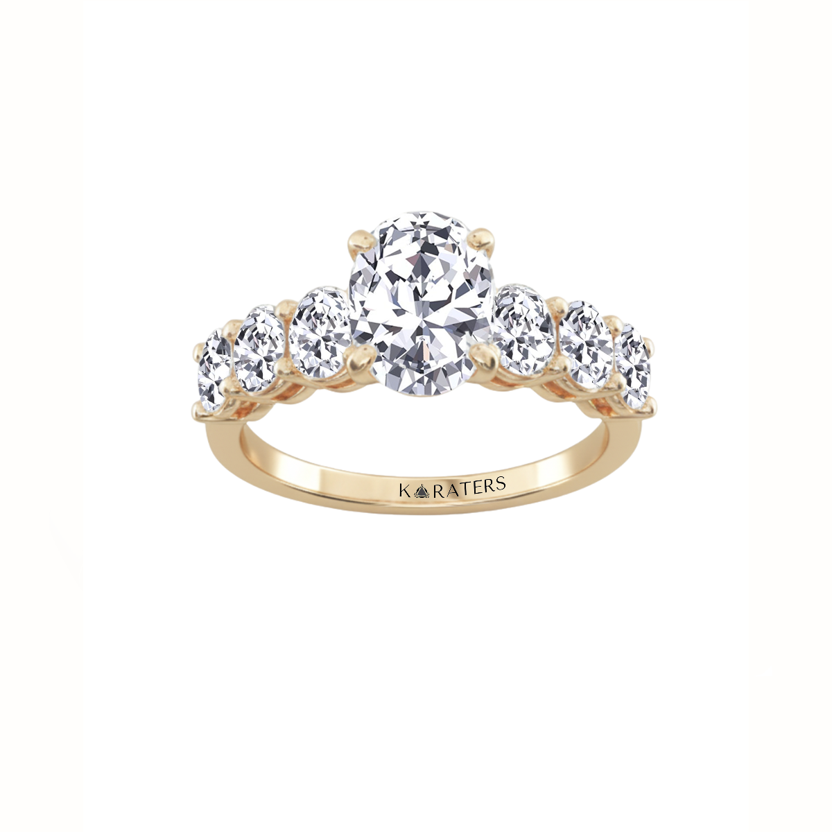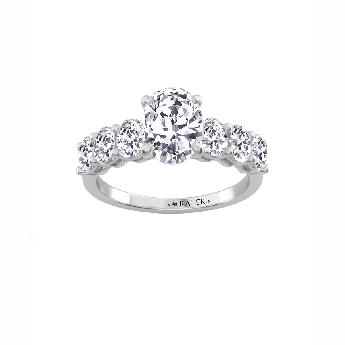 This Oval Lab-Grown Diamond Engagement Ring showcases a stunning center stone accented by three oval-cut sidestones on each side, all securely held in a refined prong setting. The arrangement enhances light reflection across every diamond, creating a seamless brilliance along the band.