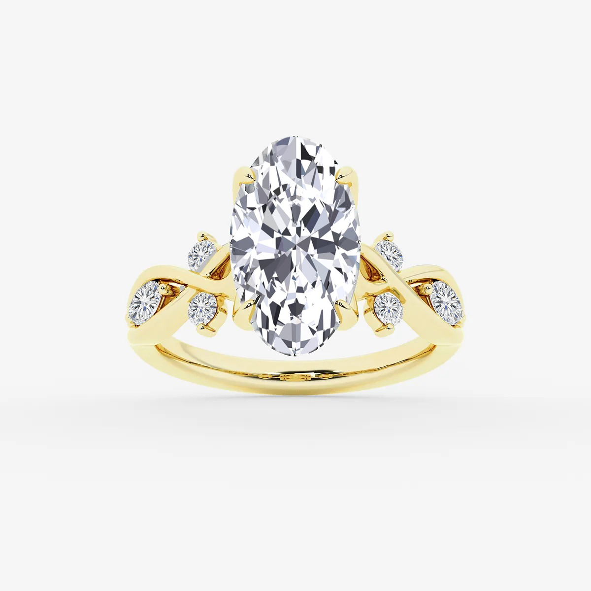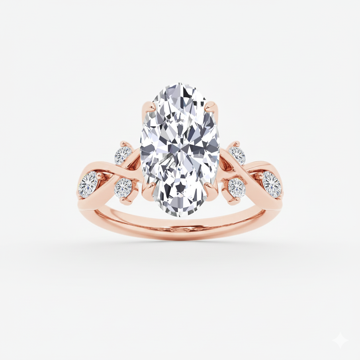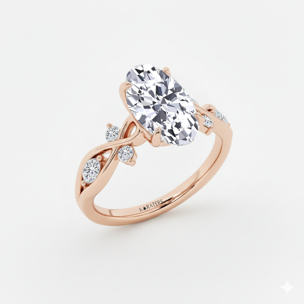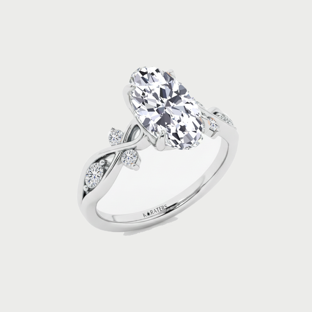 This ring features a Stunning Oval Cut Lab-Grown Diamond, set on a Twist Band. The setting gives the ring a vintage feel, while the band adds a touch of glamour. Sparkling side stones add extra brilliance and detail