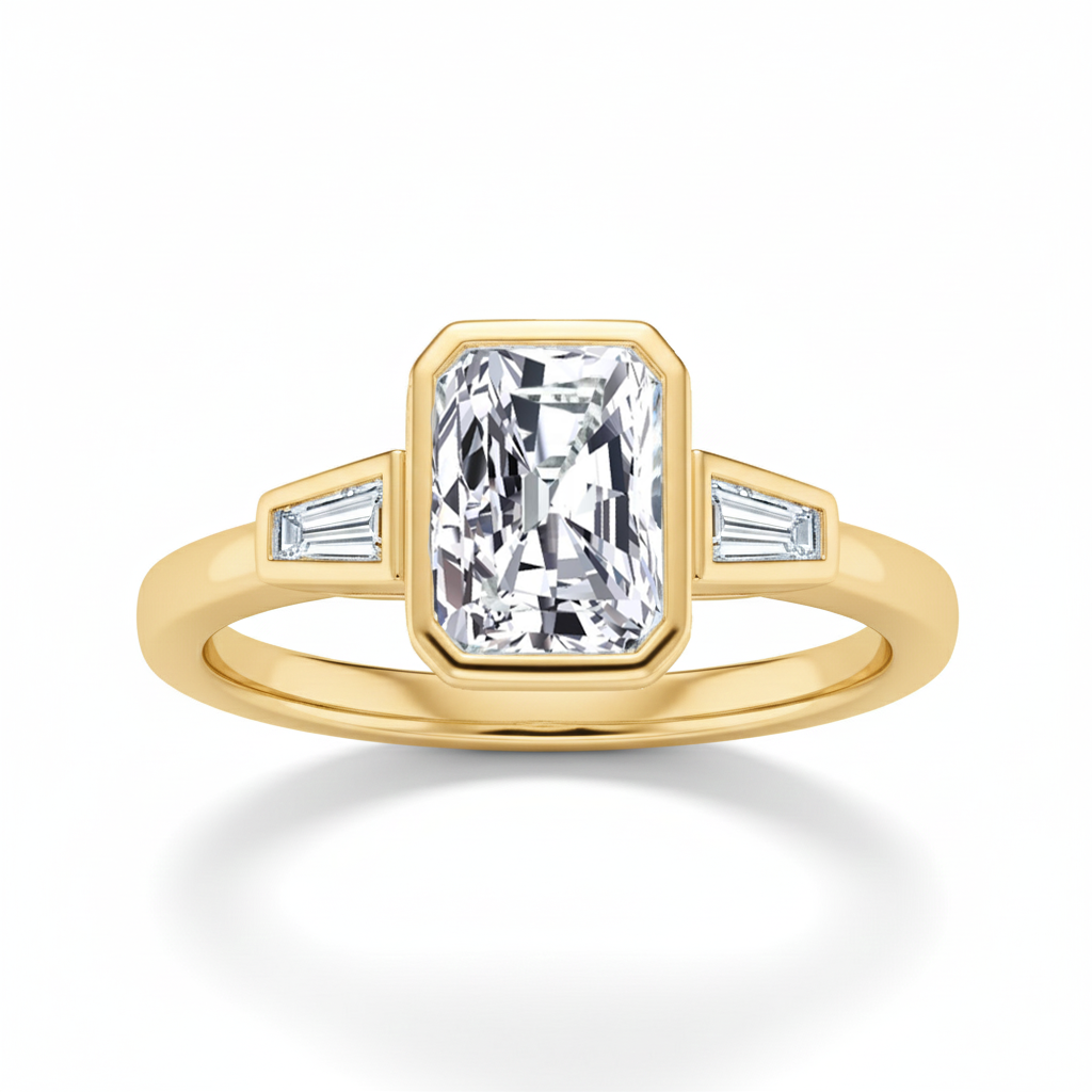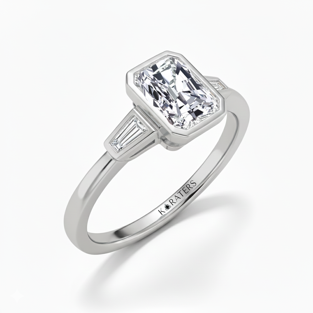 Radiant Cut Bezel Setting Lab Grown Diamond Engagement Ring With Tapered Baguette Sidestones