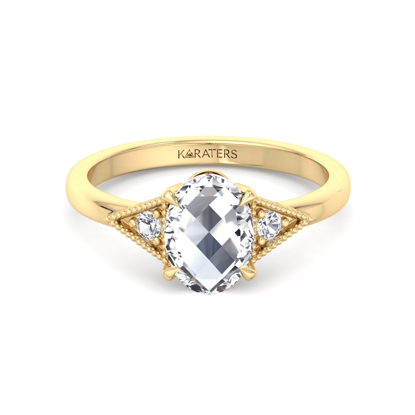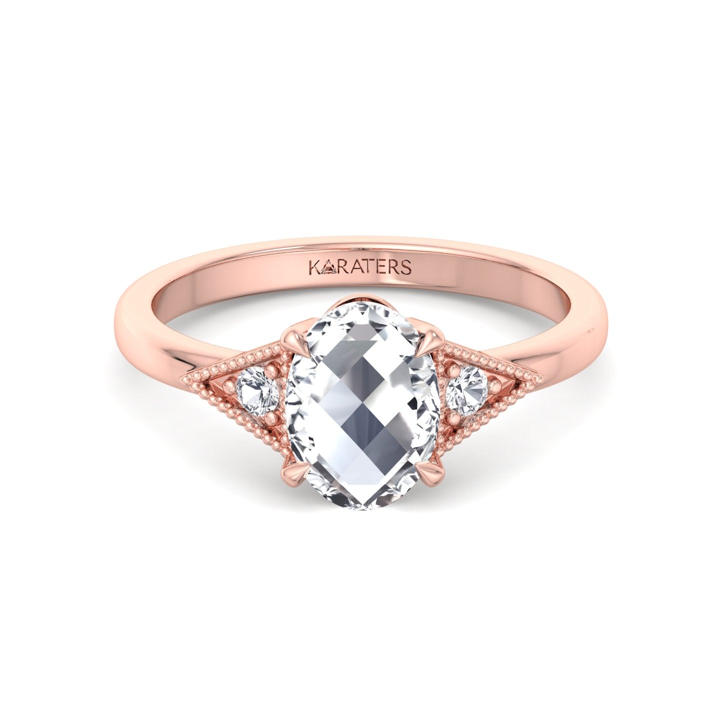 Vintage Style Oval Shape Rose-Cut Lab-Grown Diamond Engagement Ring with an oval rose-cut center stone accented by round diamonds in triangle-shaped frames. A refined design that blends antique inspiration with timeless elegance and unique artistry.