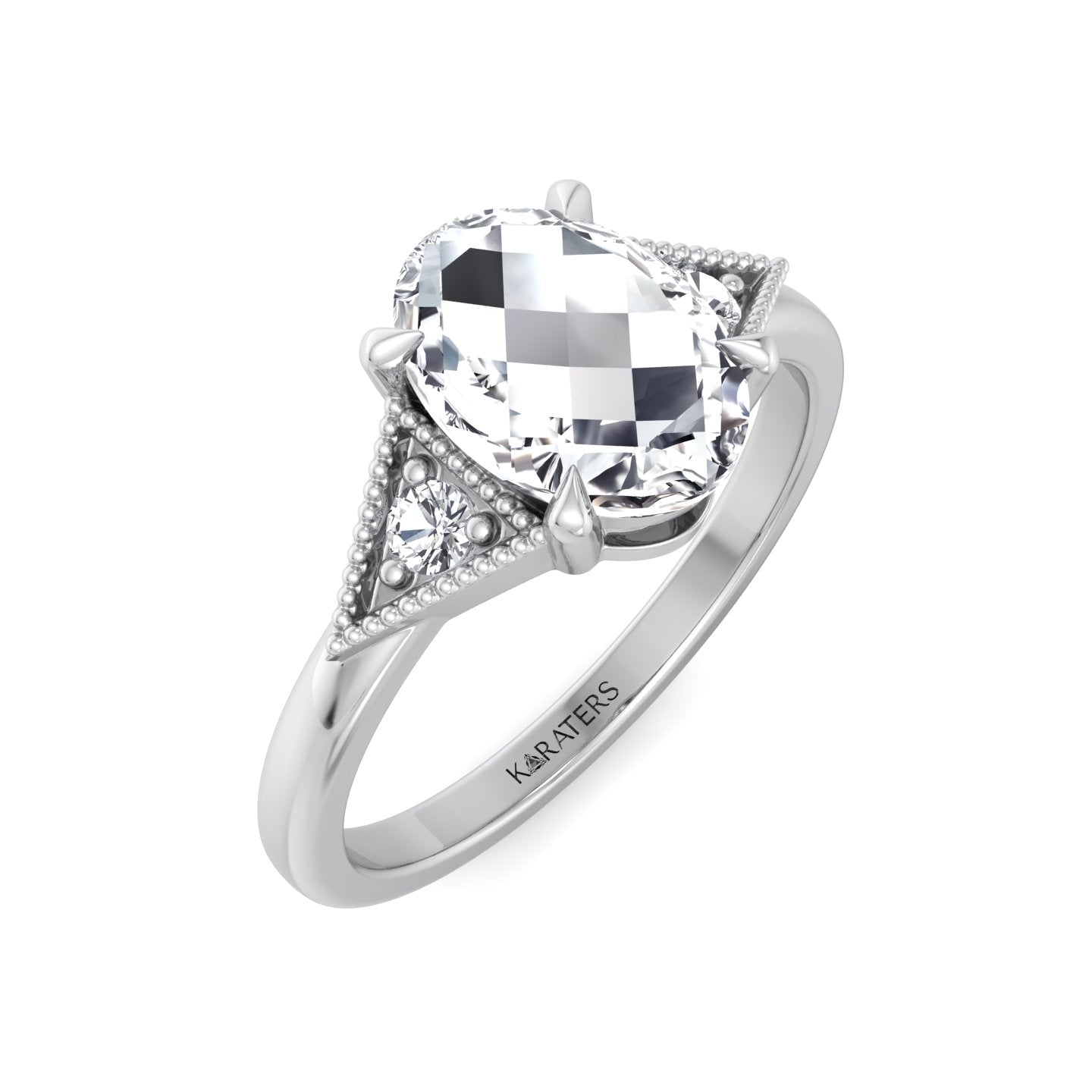 This Vintage Style Oval Shape Rose-Cut Lab-Grown Diamond Engagement Ring features an oval rose-cut center stone set securely in prongs, offering a refined and antique-inspired look. On each side, a triangle-shaped frame holds a round diamond, adding character and balance to the design.