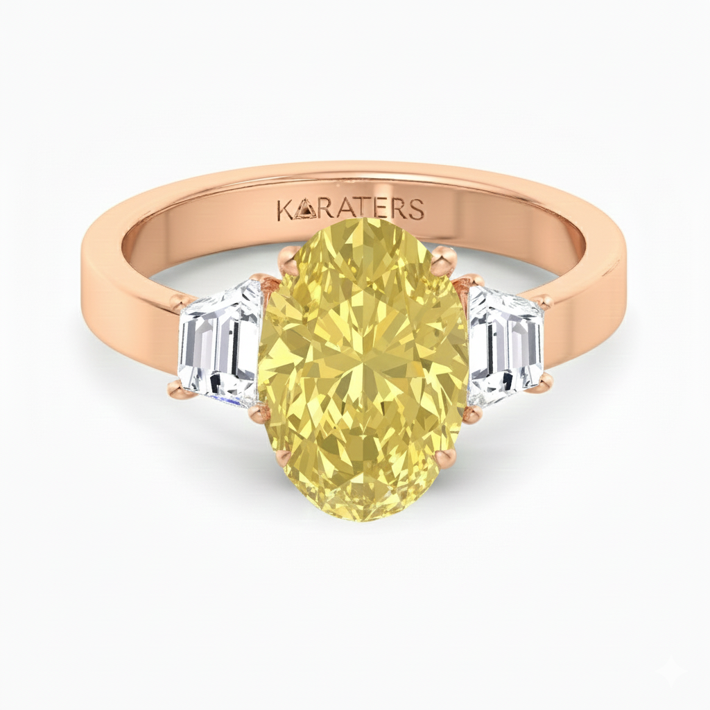 This elegant three-stone ring features a vibrant yellow oval lab-grown diamond accented by sleek trapezoid side stones. Its refined, symmetrical design blends modern style with timeless charm, offering brilliant sparkle with a sustainable touch. A striking piece crafted to stand out with effortless sophistication.